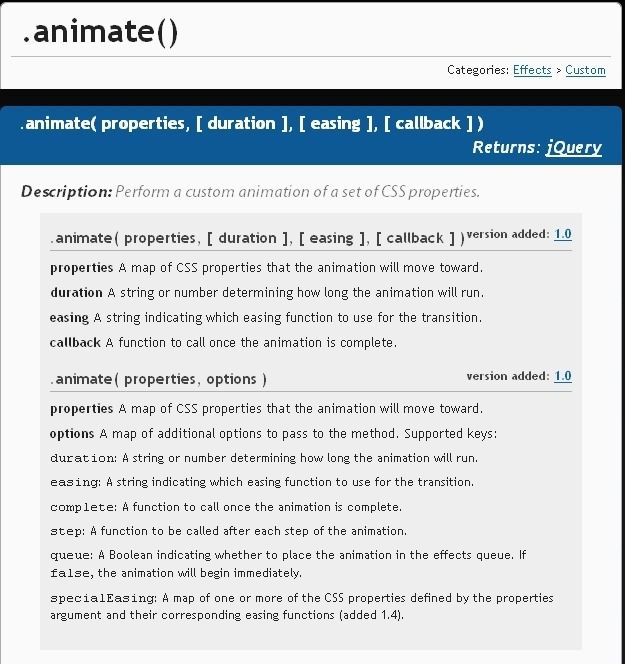 .animate뒤에 파라메터로 총 4개(혹은 2개)를 넣을수 있습니다. (2개는 1개는 properties, 나머지는 option으로 인식합니다.-4개를 않넣었을경우)